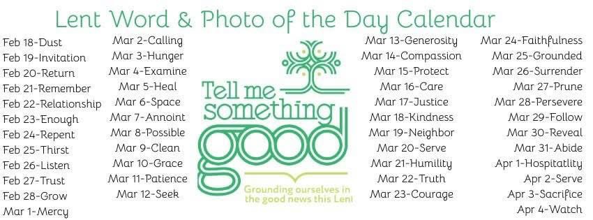 Want to develop some new spiritual practices? Sign up for the Holy Habits devotional. Or try a reflecting on a word each day, using this calendar. We’ll be posting the daily word on our Facebook page every morning, along with an invitation to share photos prompted by the daily word.